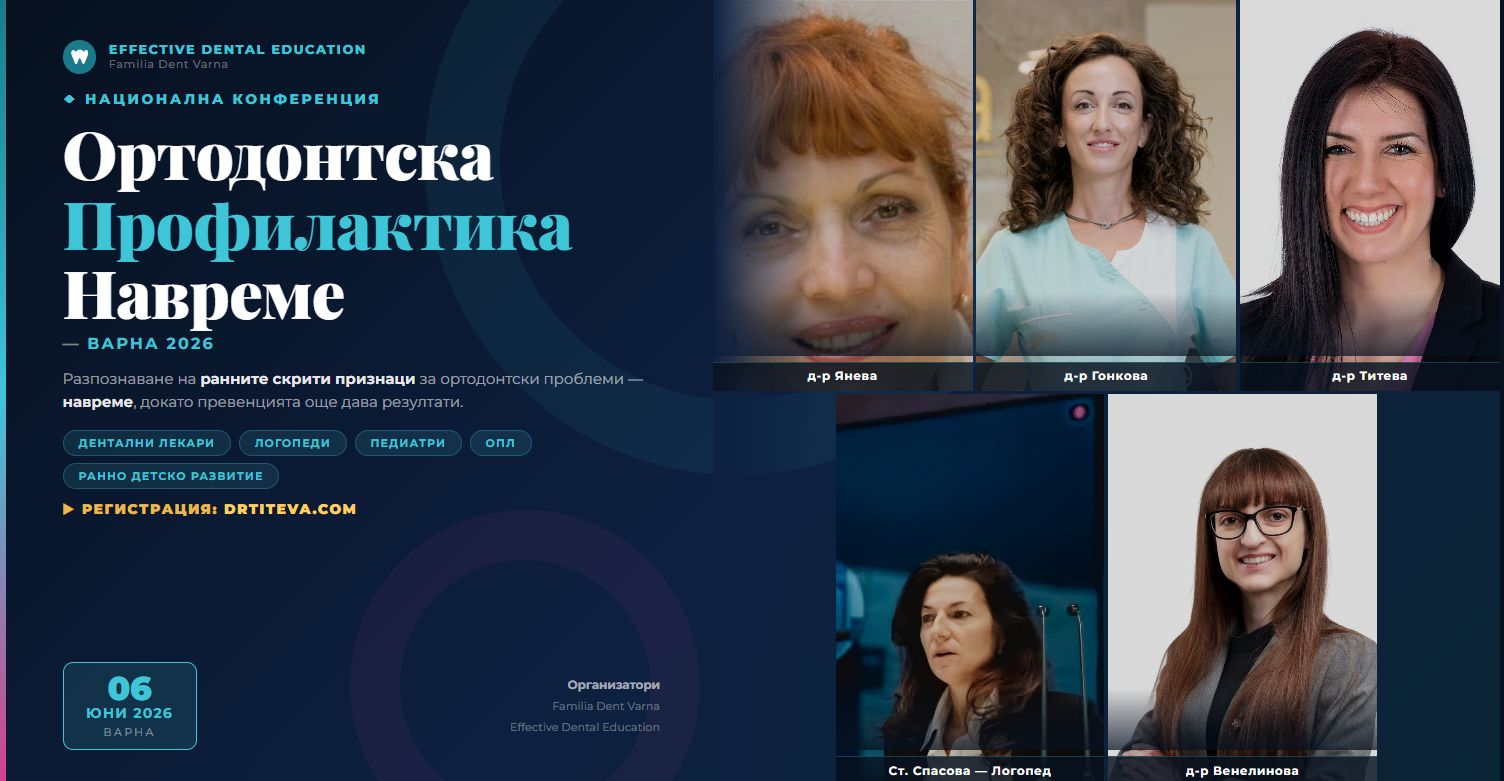 НАЦИОНАЛНА КОНФЕРЕНЦИЯ „ОРТОДОНТСКА ПРОФИЛАКТИКА НАВРЕМЕ“ е насочена към общопрактикуващи дентални лекари и специалисти, които работят с деца- педиатри, общопрактикуващи лекари, логопеди, специалисти по ранно детско развитие.