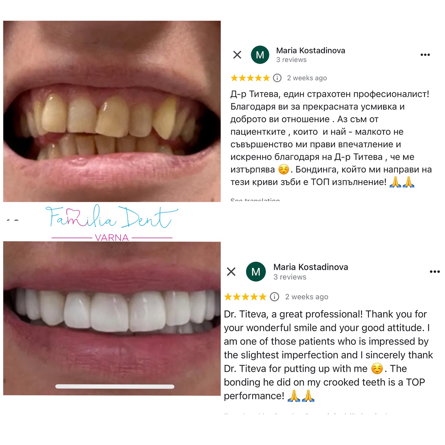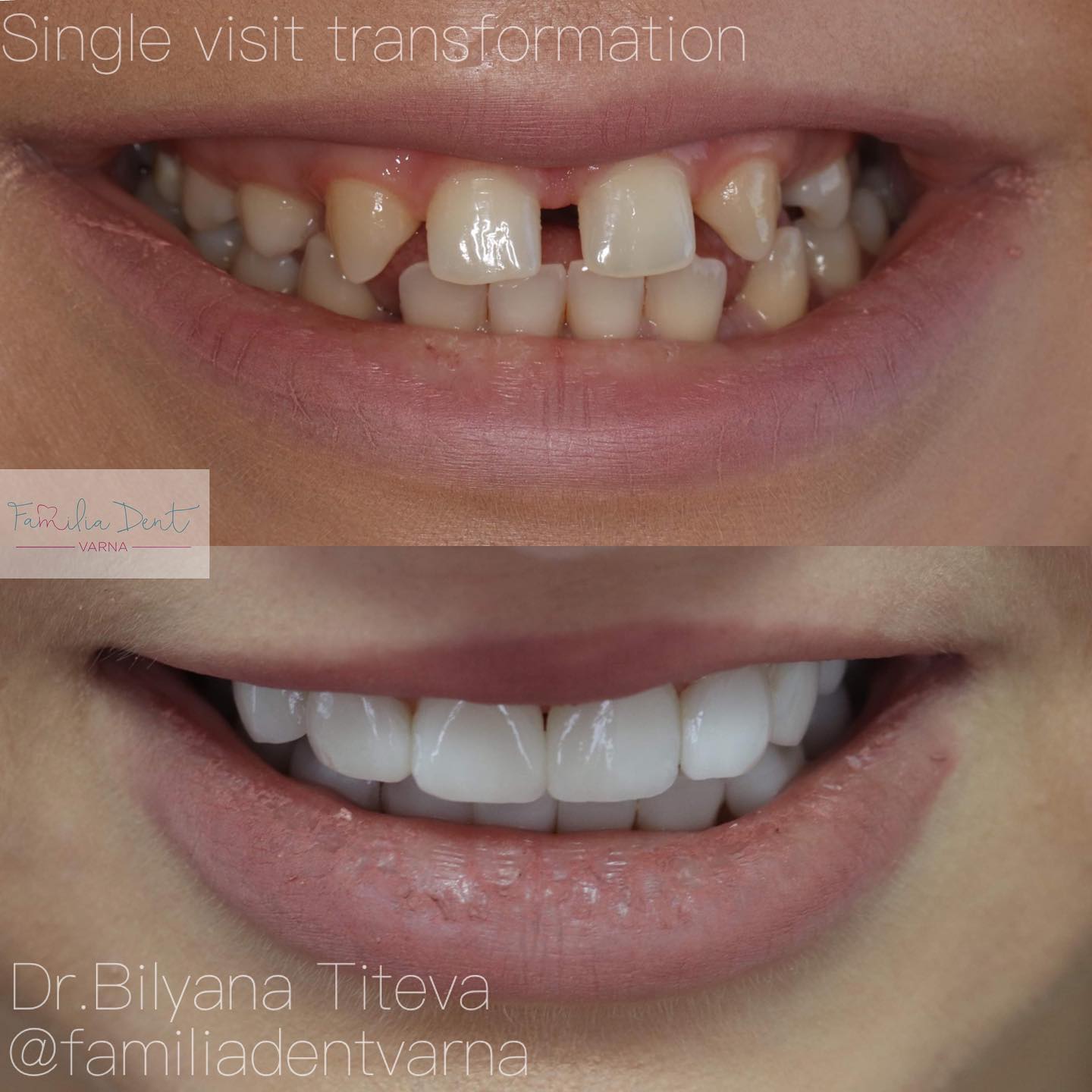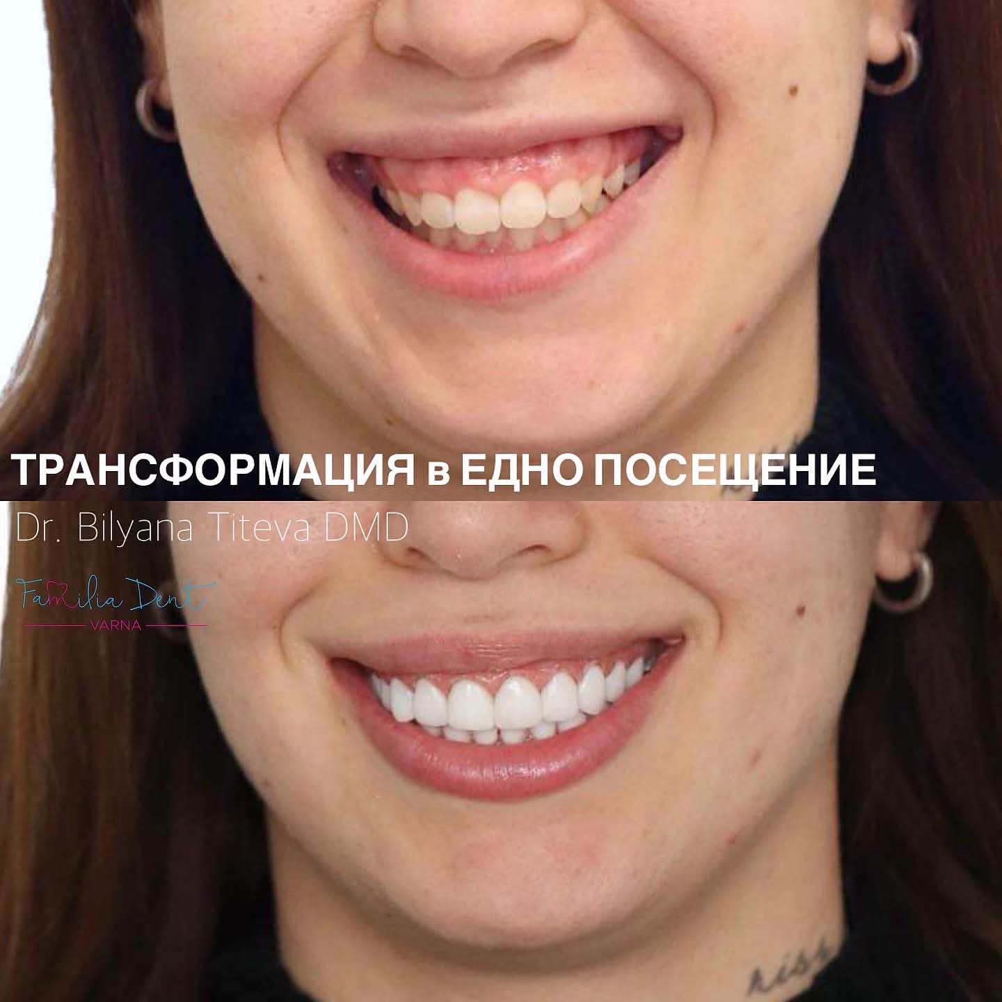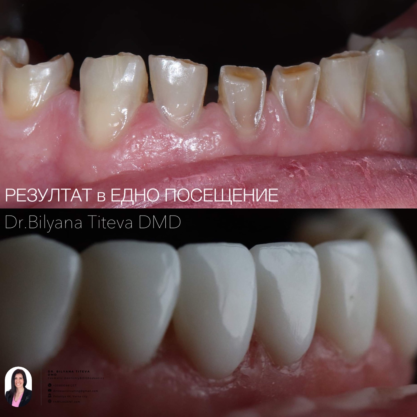 Виж тези случаи- напълно трансформирани усмивки само в есно посещение по моя протокол DR.TITEVA ONE SMILE, в който разглеждаме всички съпътстващи моменти от прегледа и планирането, през лазерната гингивопластика, избелване, изграждане на самите фасети и РЕТЕНЦИЯ на резултатите в годините.
