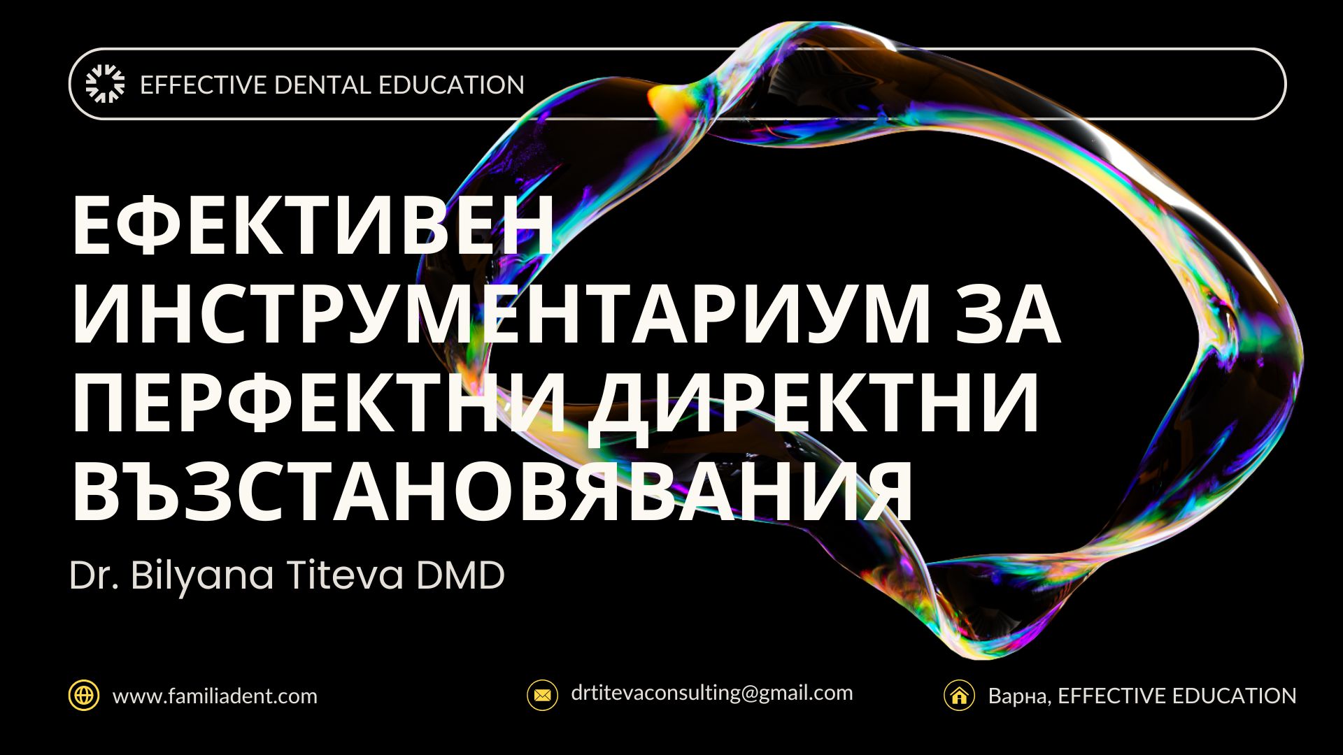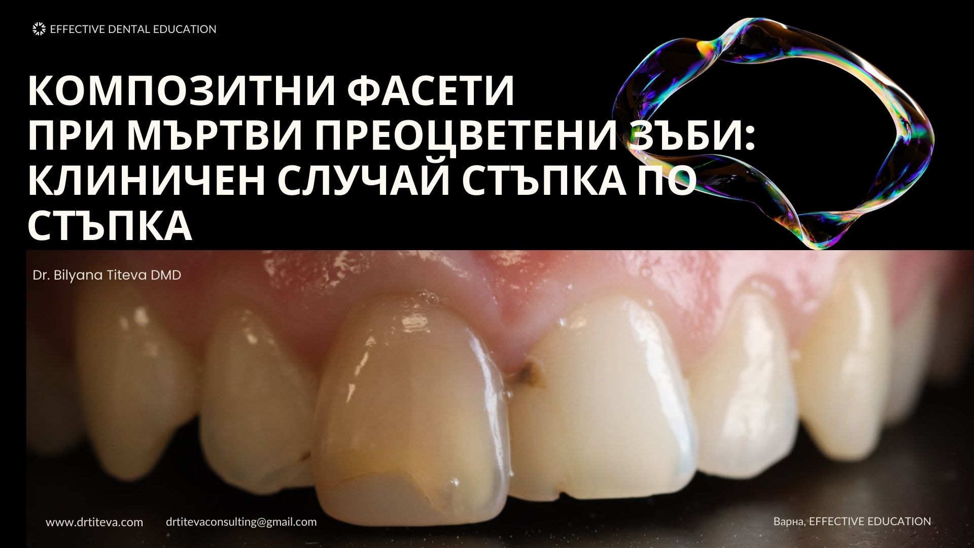 Ще разгледаме основните принципи от моя клиничен опит, които дават предвидими резултати. Ще разгледаме и как да предотвратите грешки като сивеене, прекалена прозрачност на възстановяванията във фронта, как да избегнем да изглеждат като бяло петно, проблемът с по-мътен зъб, избор на правилния цвят, как да не се получава демаркационна линия и още и още ви очаква в тази среща.